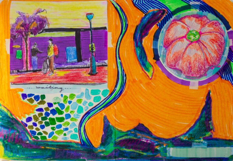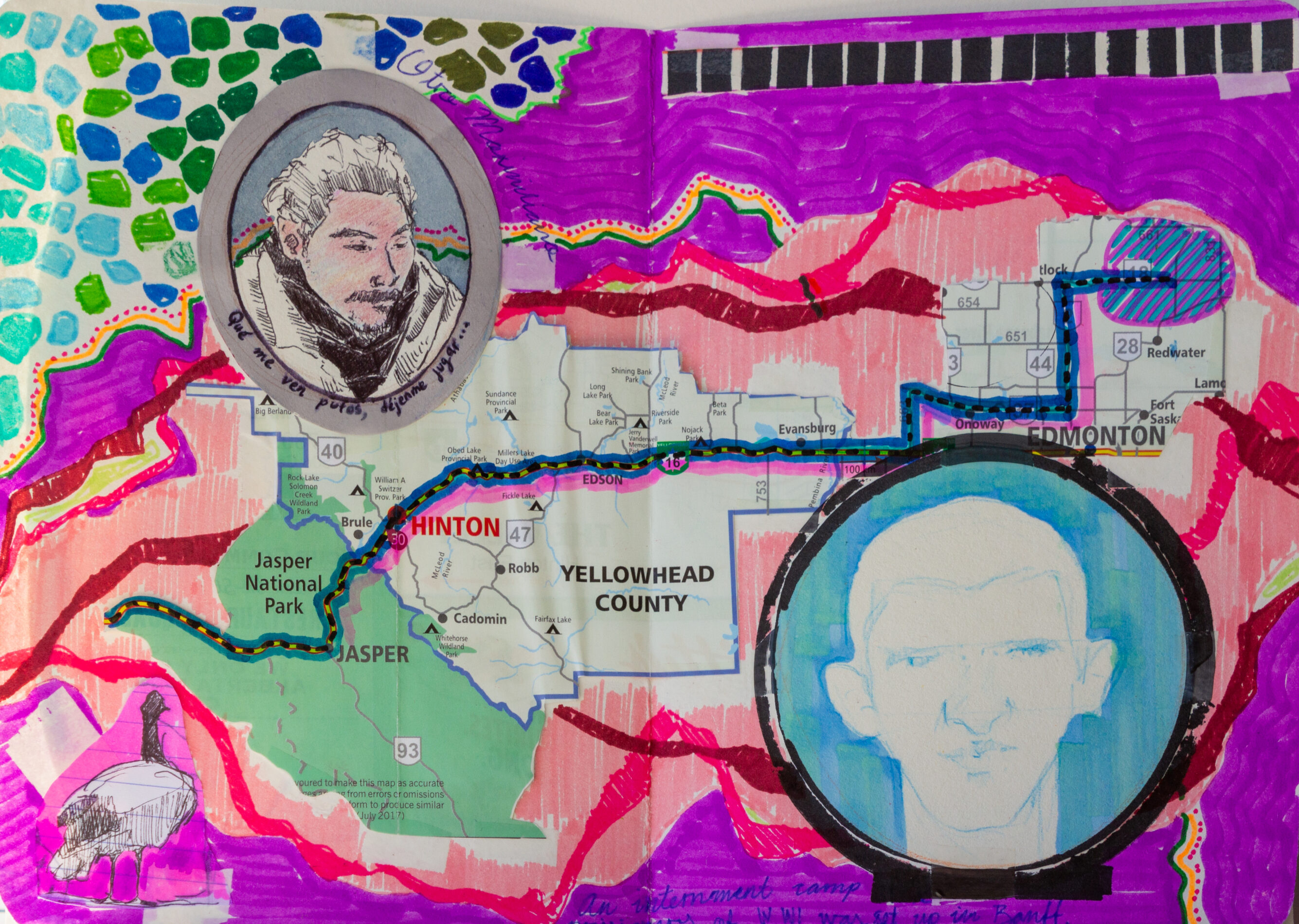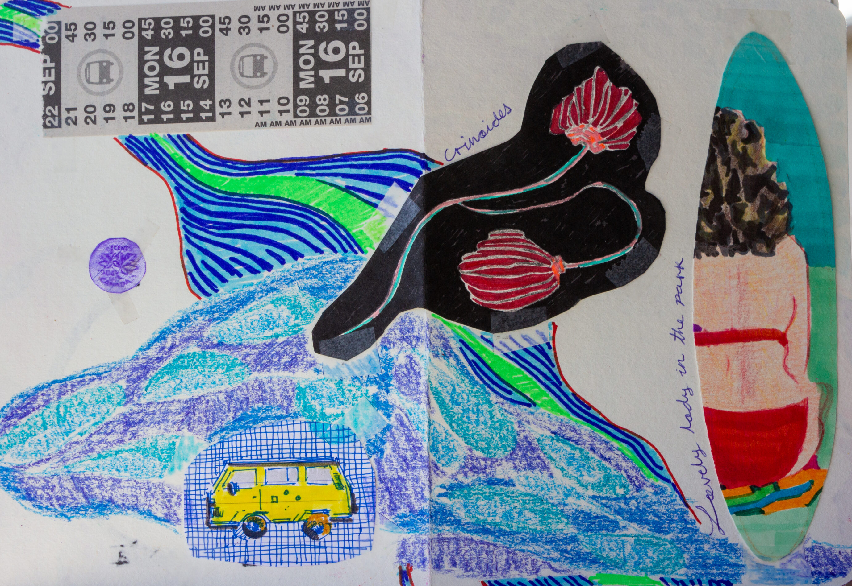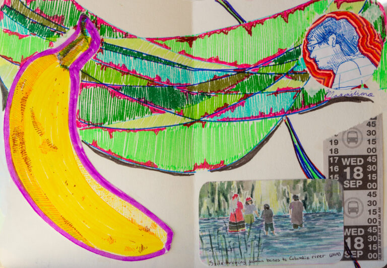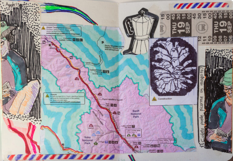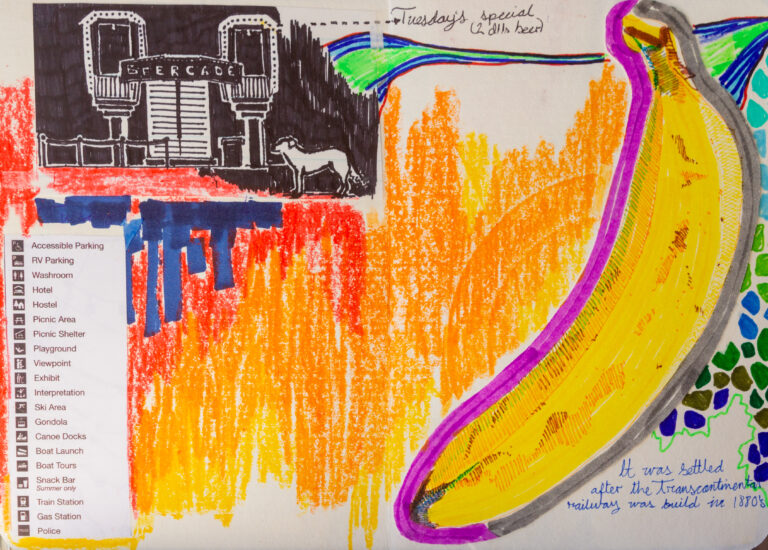 During my stay in the Okanagan Valley, I crafted a series of postcards that captured the essence of the cherry harvest season. These postcards, enriched with elements such as bus tickets, portraits, quotes from friends and locals, and the artistic mapping of my journey, served as my expression to weave together time, space, and my narratives, immortalized in a sort of artistic travel journal. This artistic initiative, supported by visual storytelling, gave rise to a unique representation of my time in the region.